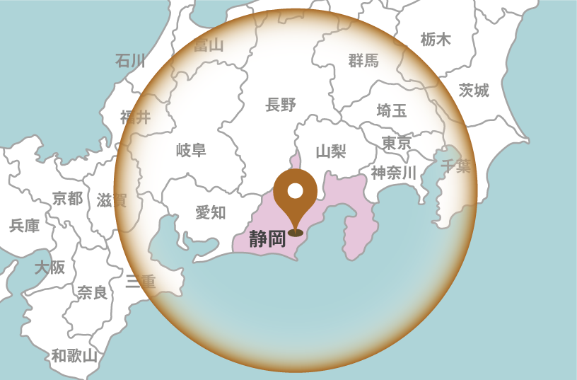 静岡県(焼津市/熱海市/伊豆市/伊豆の国市/伊東市/磐田市/御前崎市/小山町/掛川市/河津町/川根本町/函南町/菊川市/湖西市/御殿場市/静岡市/島田市/清水町/下田市/裾野市/長泉町/西伊豆町/沼津市/浜松市/東伊豆町/袋井市/富士市/藤枝市/富士宮市/牧之原市/松崎町/三島市/南伊豆町/森町/吉田町)、愛知県、山梨県、富山県、神奈川県